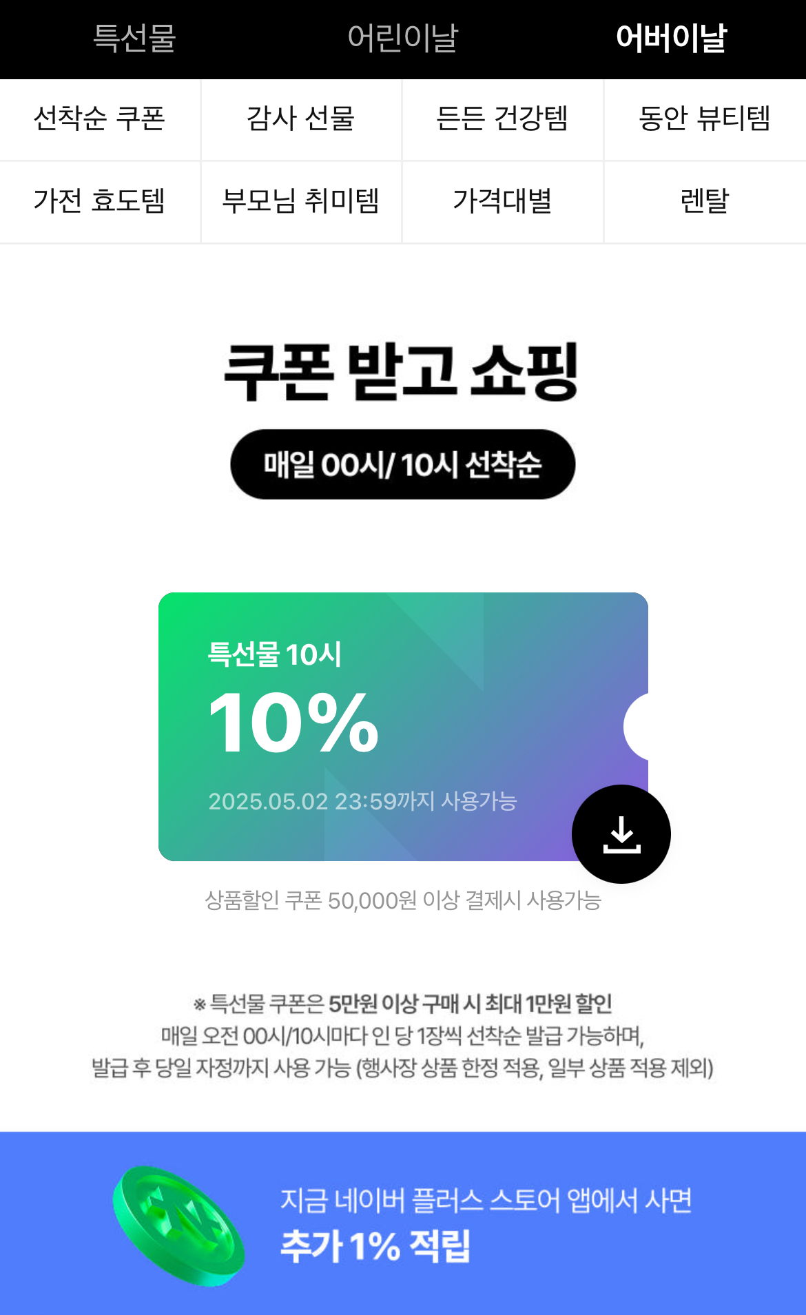 쿠폰은 5만원 이상 구매 시 최대 1만원까지 할인되며, ID당 하루 한 번만 다운로드할 수 있어 서두르시는 게 좋습니다.