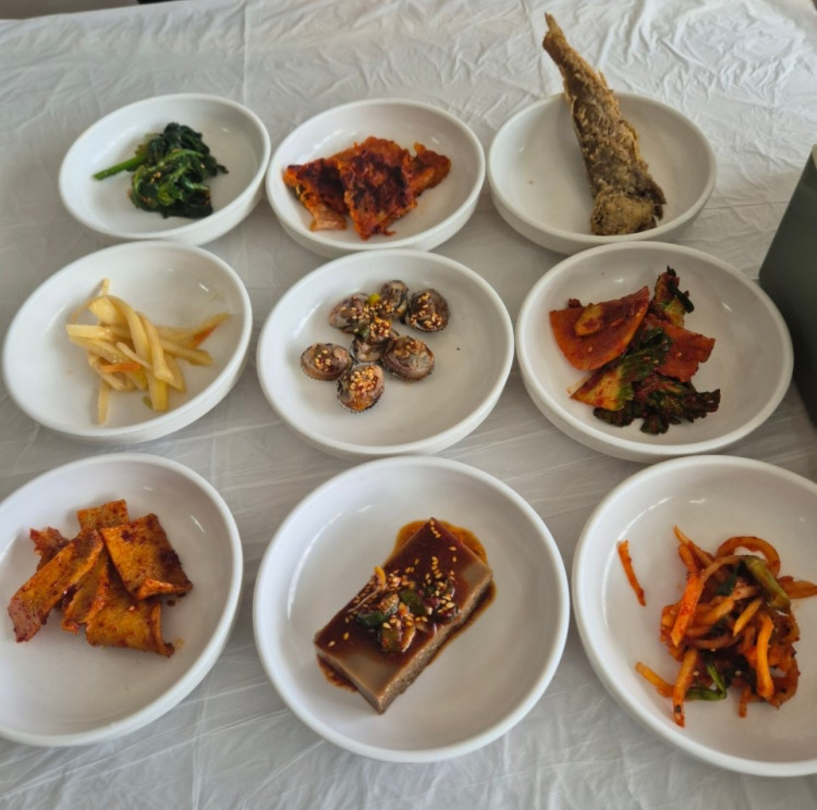 콩나물무침, 감자조림, 멸치볶음 같은 익숙한 반찬들이지만,