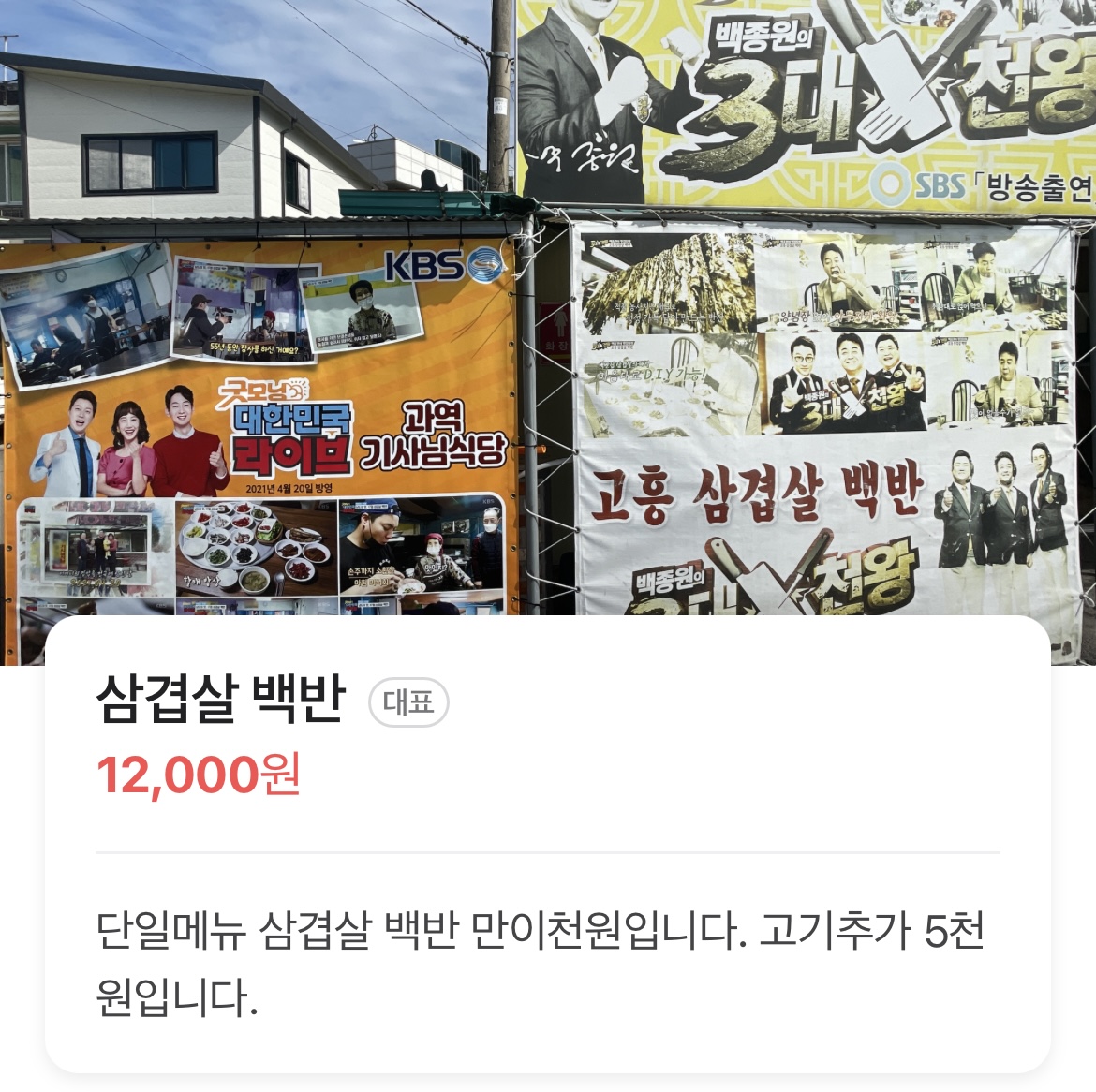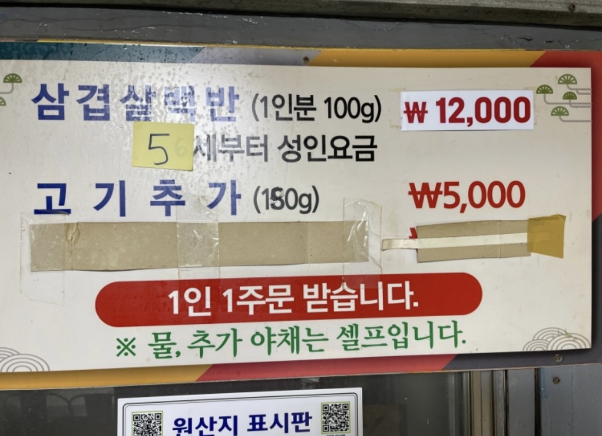 | 삼겹살 백반 | 12,000원 | 삼겹살 100g + 15가지 반찬 + 쌈채소 + 찌개 + 밥 |