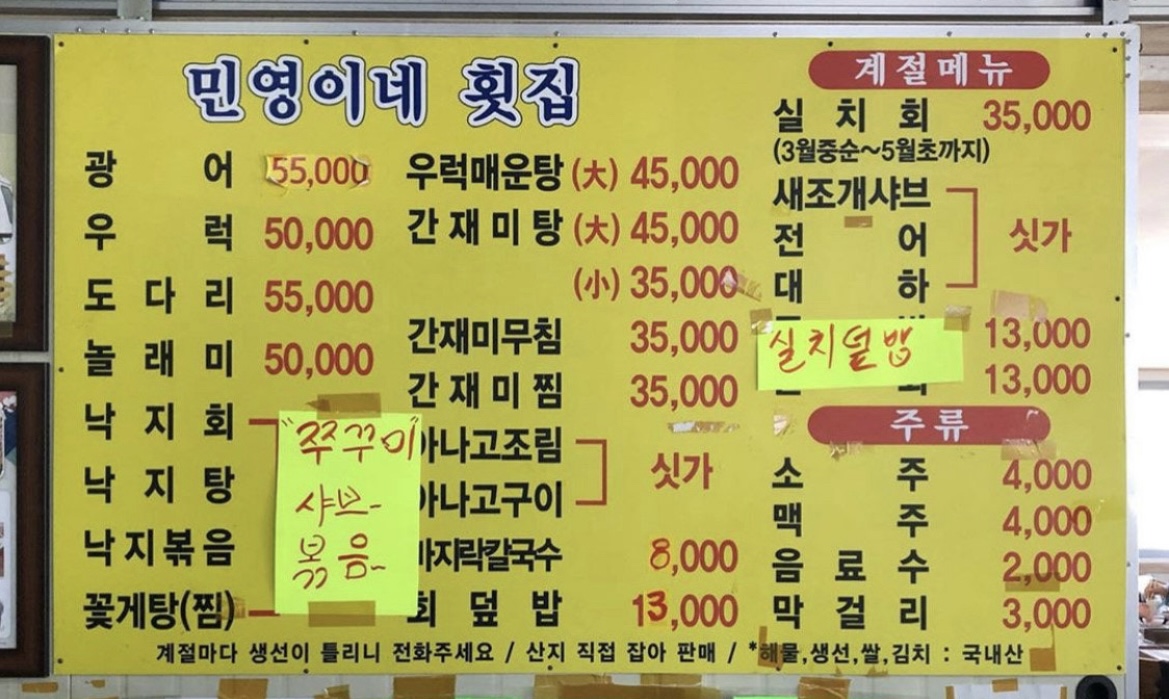 | 실치회 (2인 기준) | 시가 (약 40,000원대) |