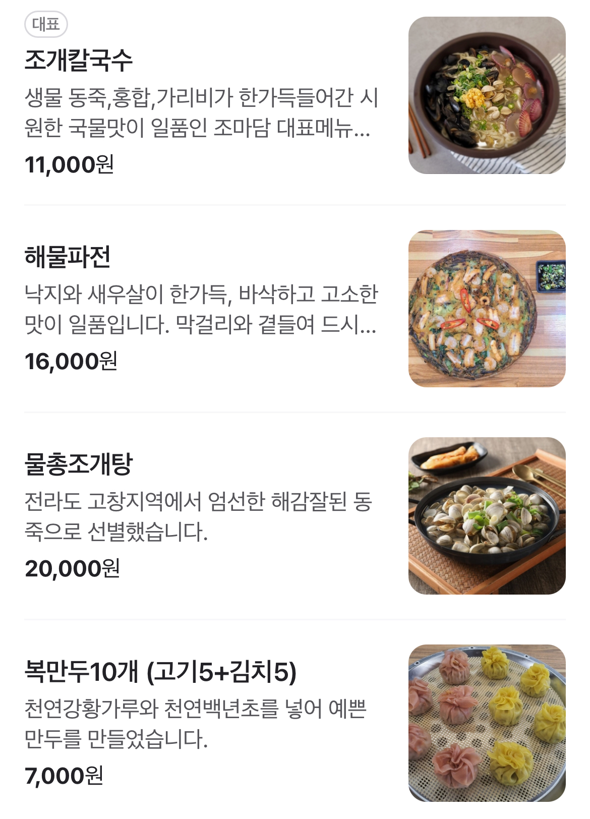 | 대왕조개칼국수 | 11,000원 | 생생정보 방영, 푸짐한 해산물과 국물 |