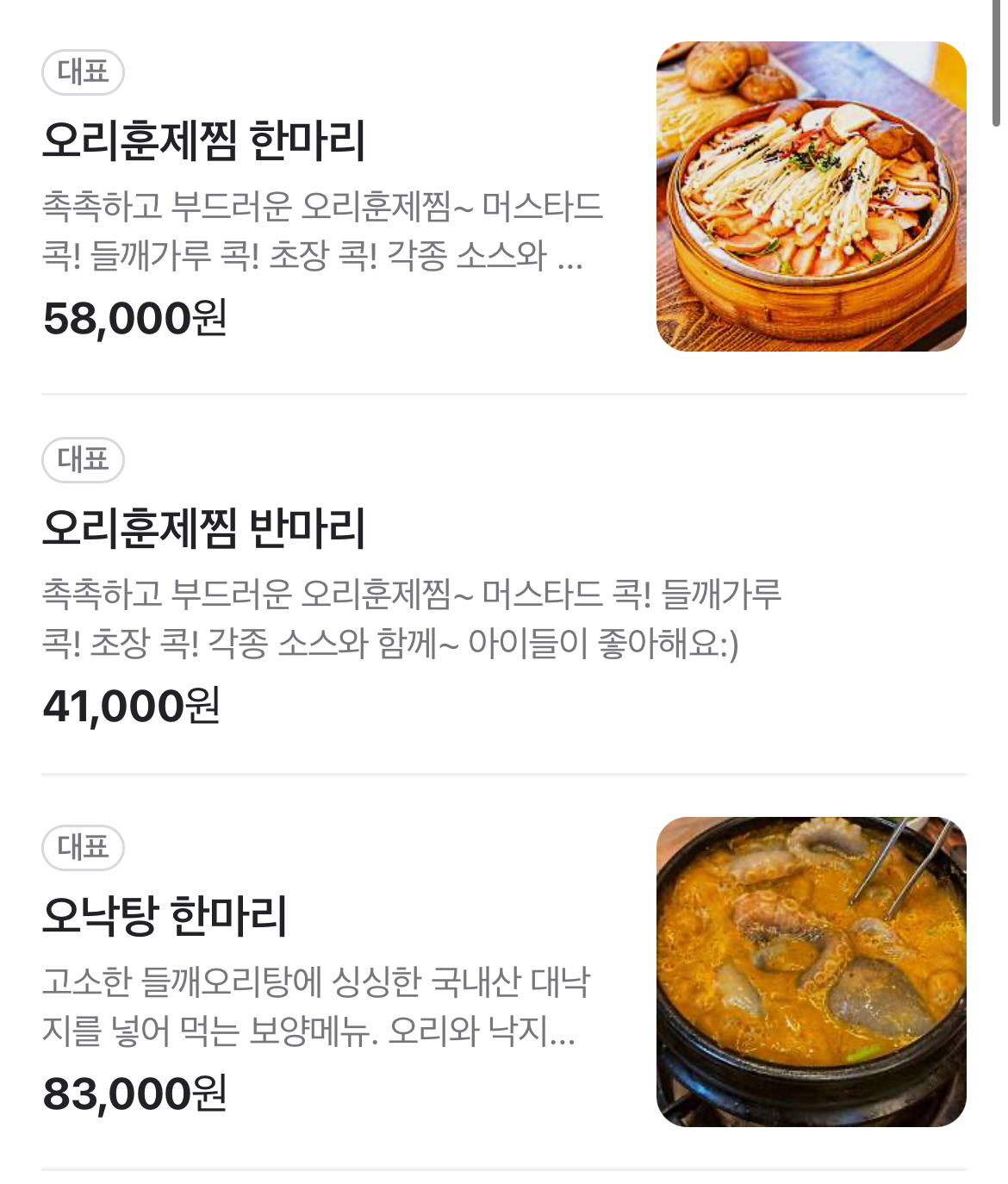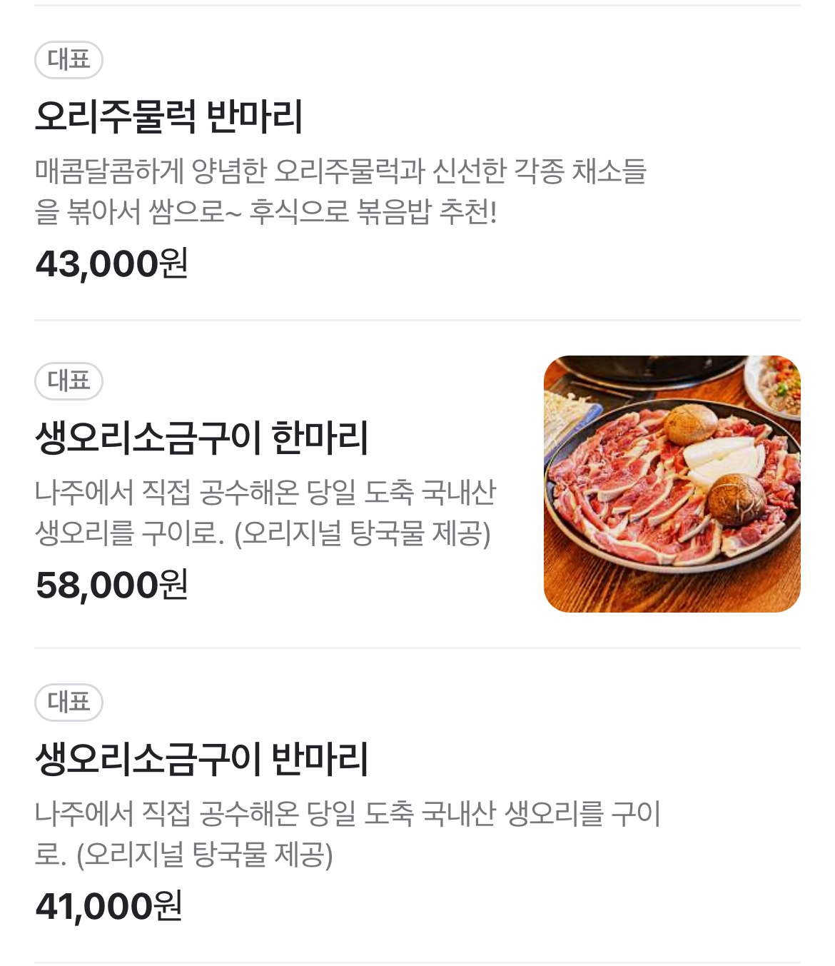 매콤한 양념과 부드러운 국내산 생오리의 완벽 조화