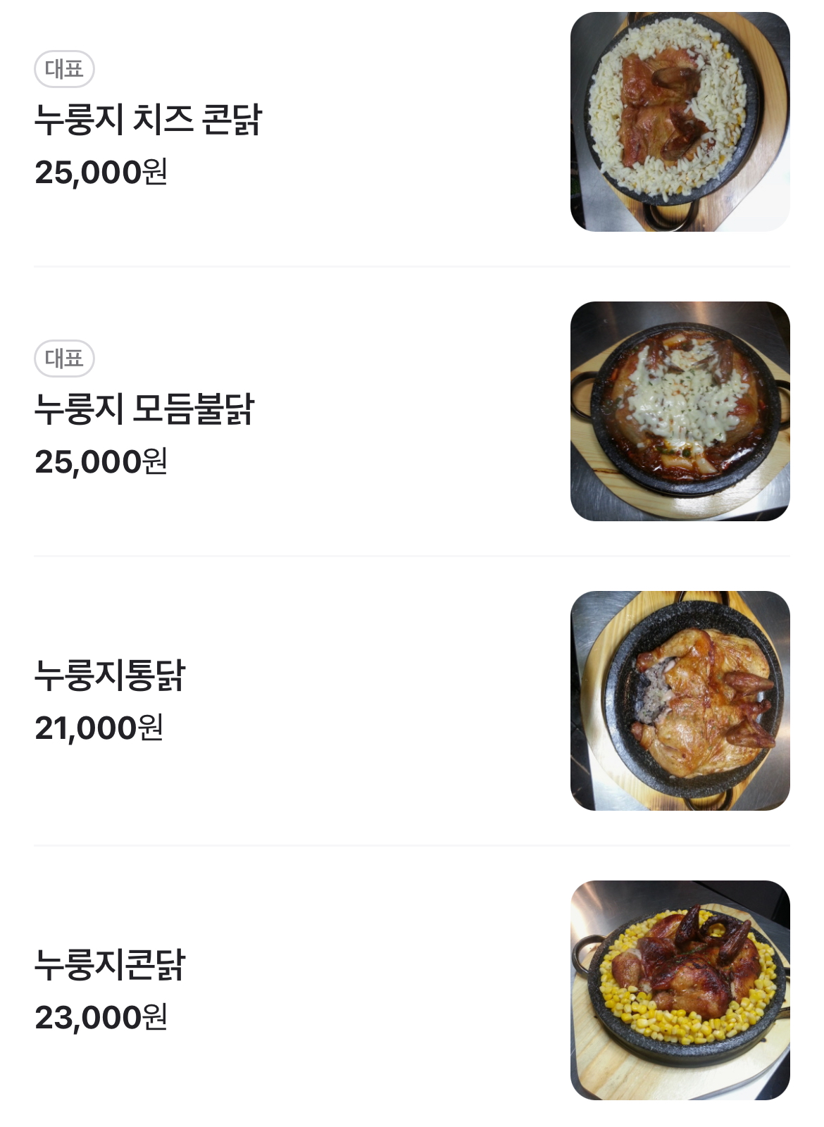 | 인기메뉴 | 치즈누룽지통닭, 장작통닭, 매운불닭 |