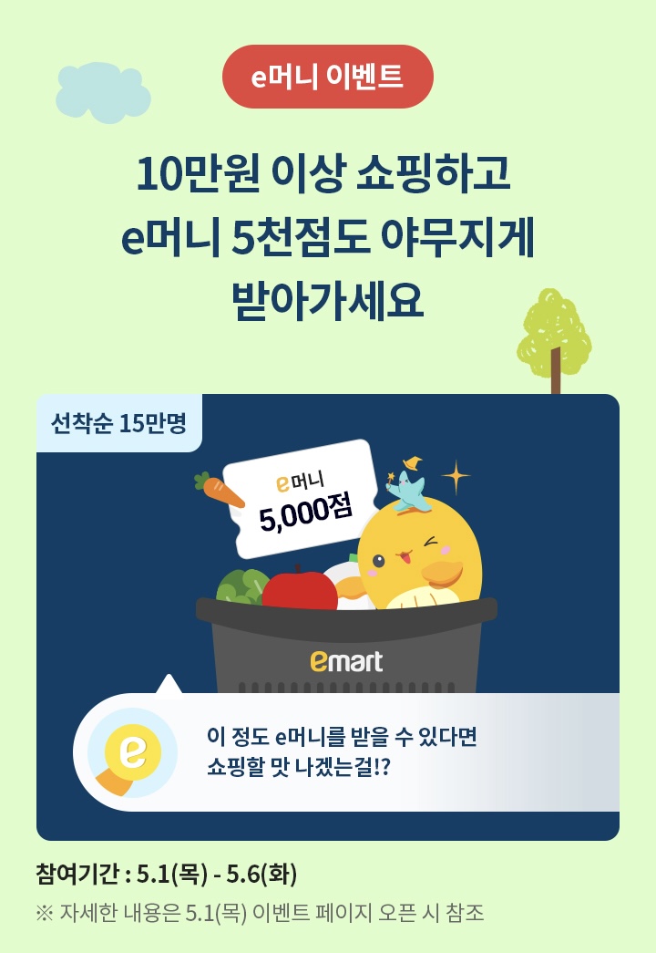 - 내용: 10만 원 이상 구매 시 e머니 5천점 지급