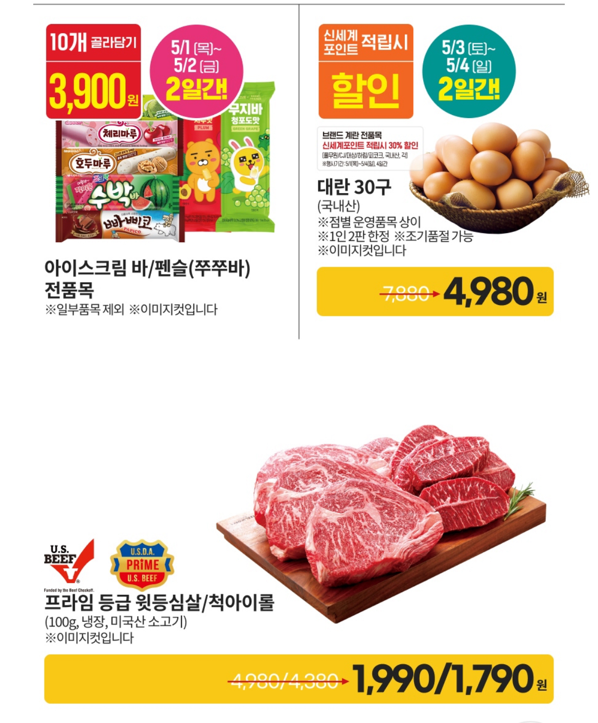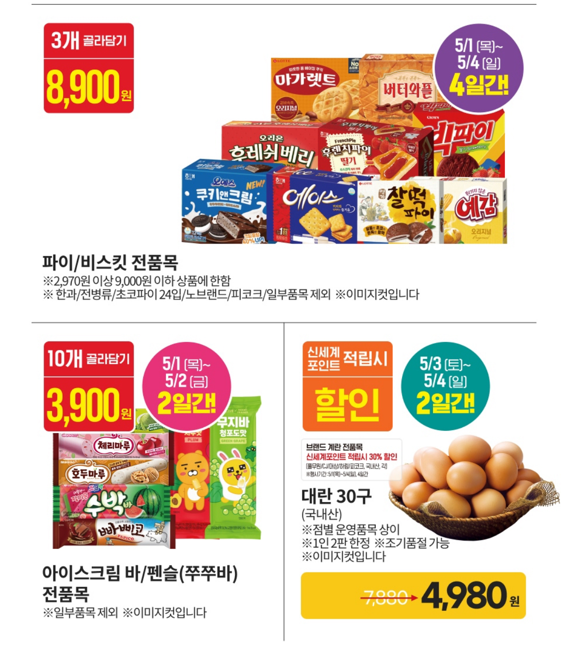- 아이스크림 10개 3,900원 / 스낵 3개 34% 할인 / 즉석밥 3개 9,900원