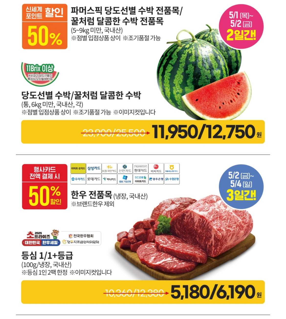 - 한우 전 품목 반값 (5/2~4, 행사카드 전액 결제 시)