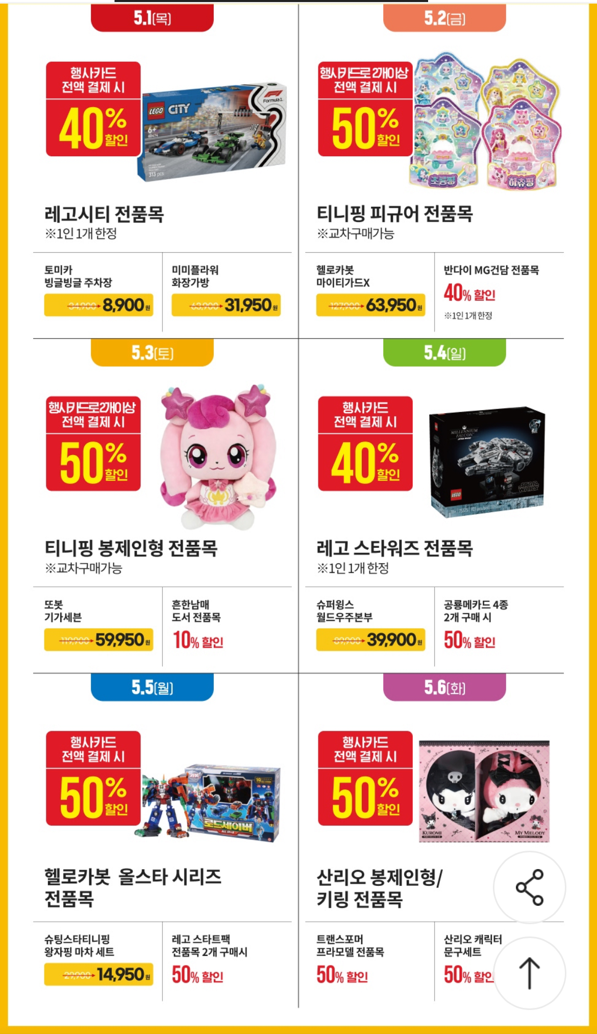 5월 5일 어린이날 당일, 행사카드 전액 결제 시 요일특가가 적용됩니다.