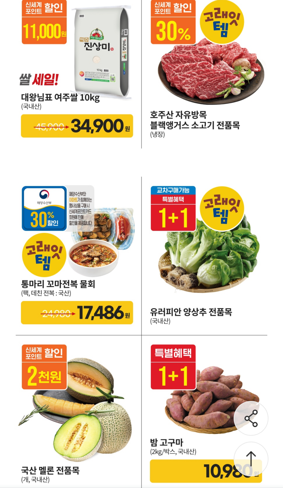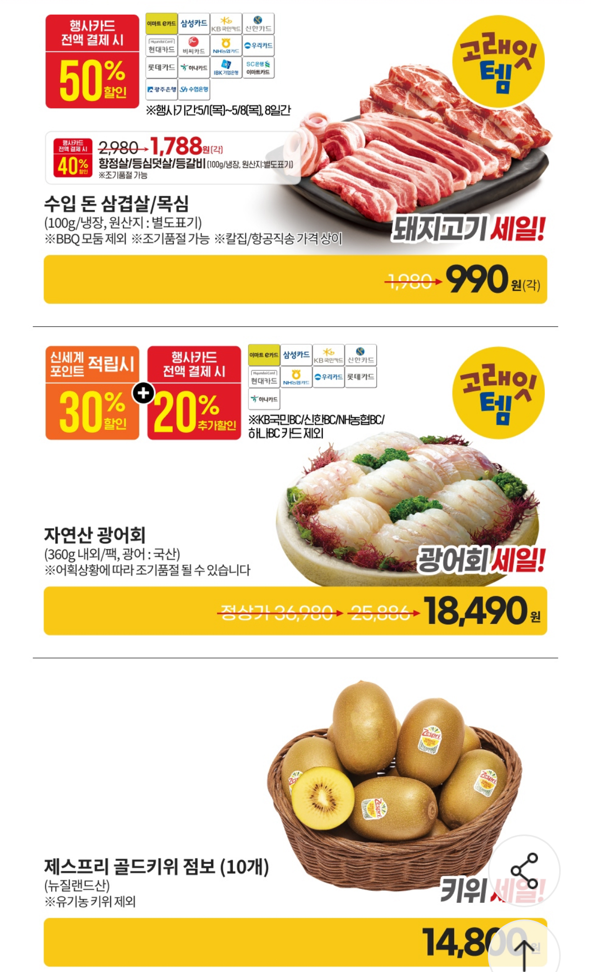 | 특가 이벤트 | 골라담기, 응 가격, 고기파니 등 |