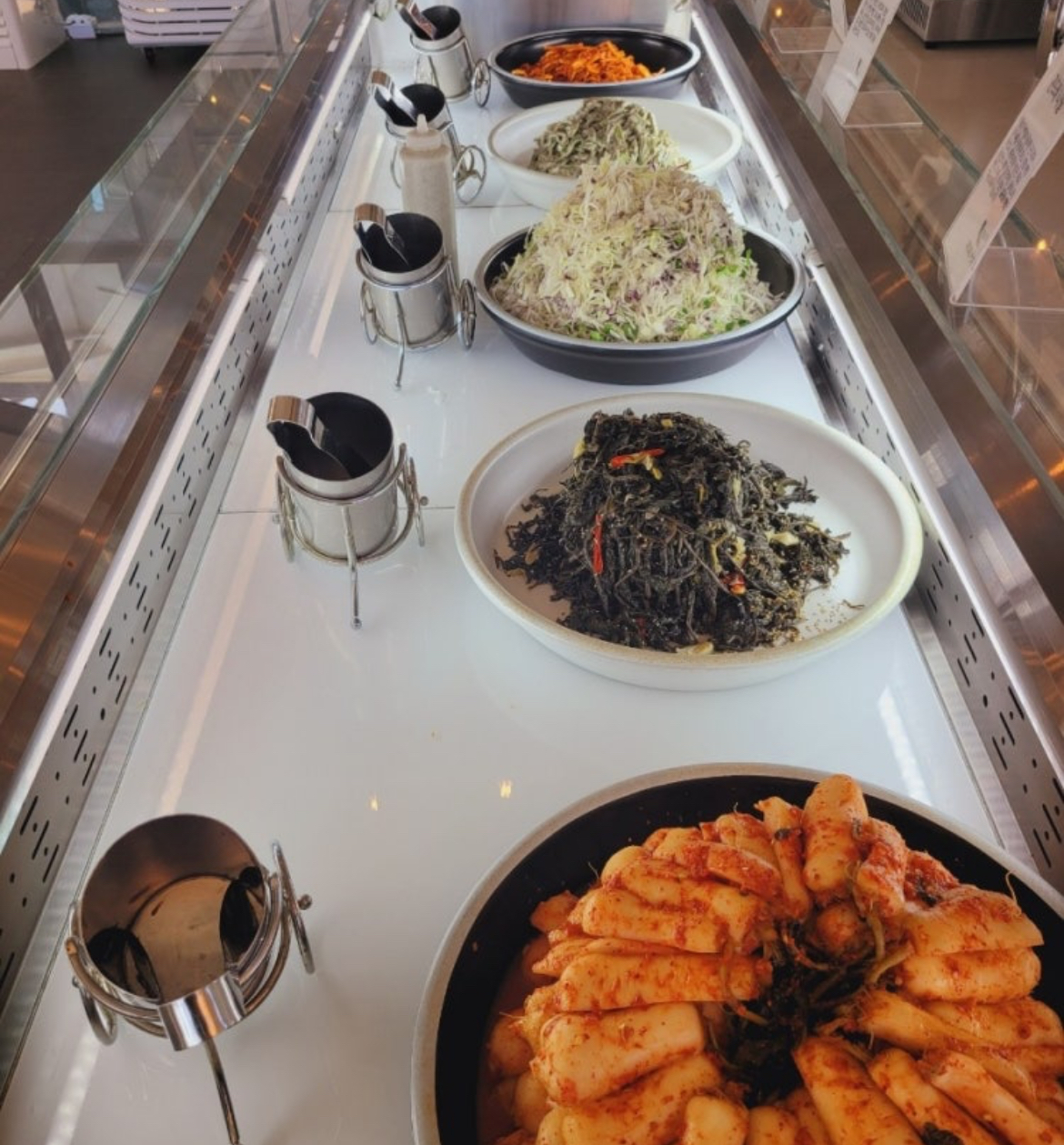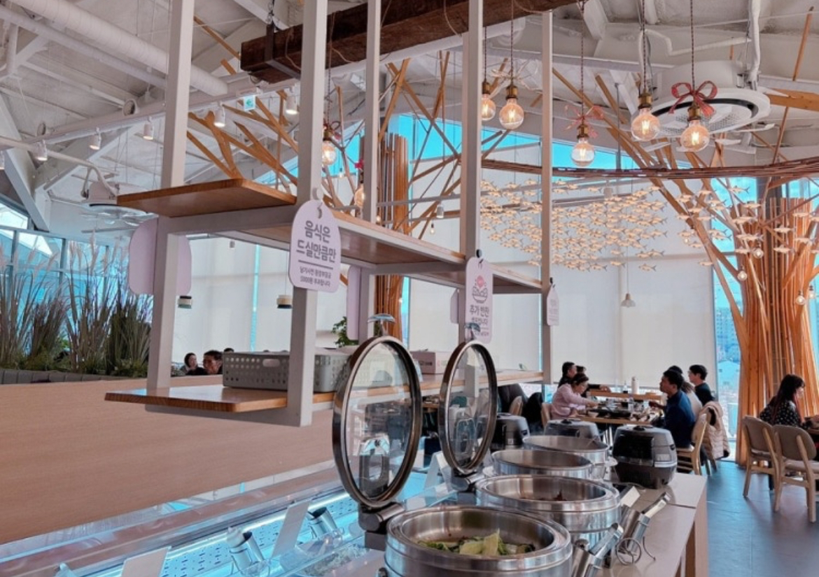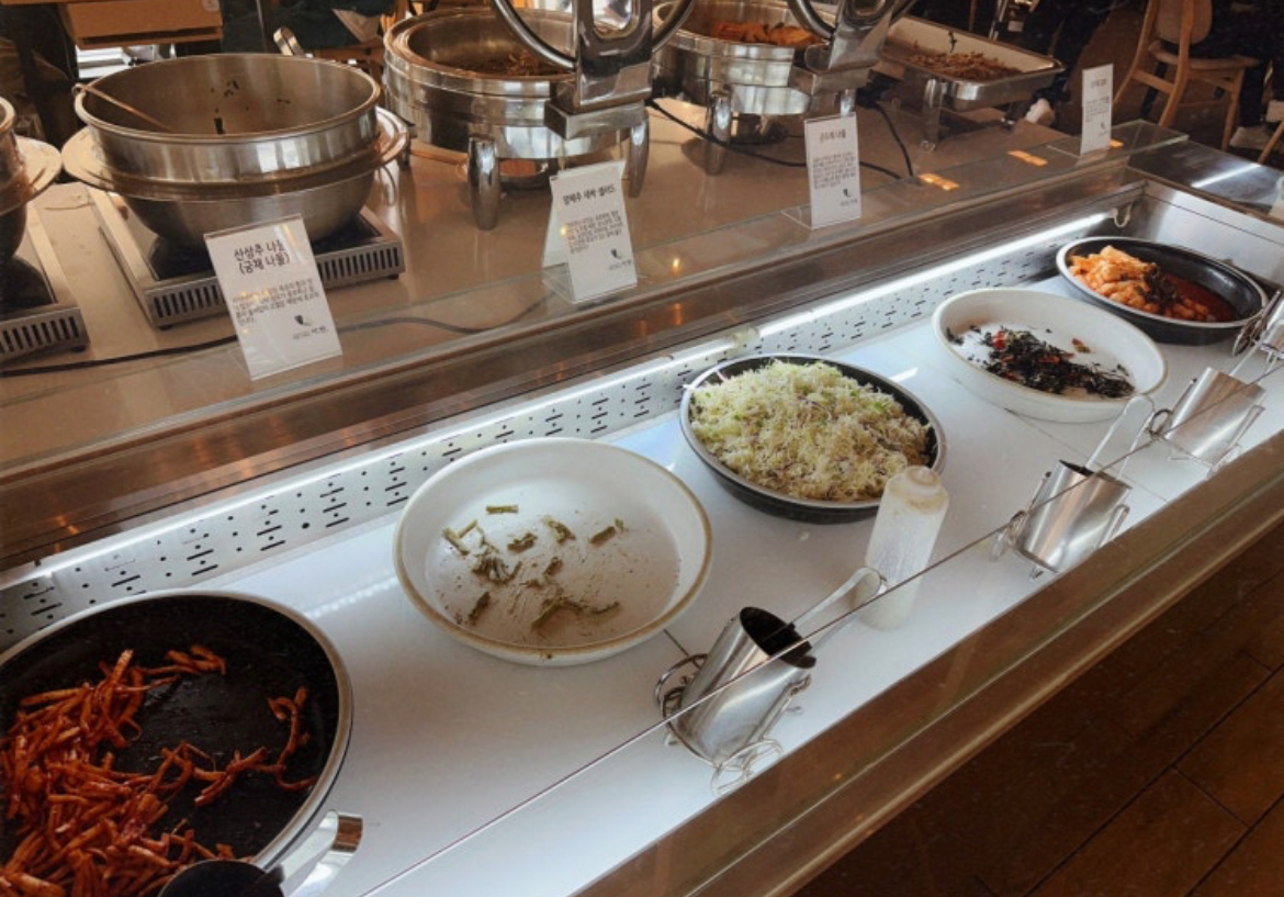매장 중앙에는 셀프바가 마련되어 있어 기본 반찬, 밥, 국 등을 자유롭게 리필할 수 있습니다.