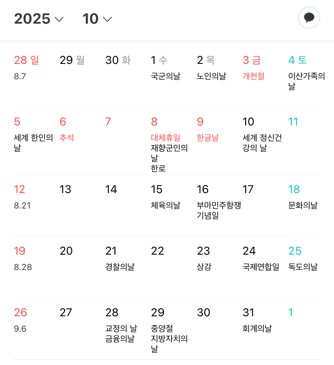 A2. 일반적으로 공휴일 발표는 2~4주 전에 이뤄집니다. 2025년 9월 중순 전후가 유력합니다.